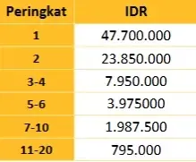 1. Total Hadiah Event ini adalah sebesar Rp 9.131.200.000,- yang akan dibagikan kepada seluruh pemenang Tournamen